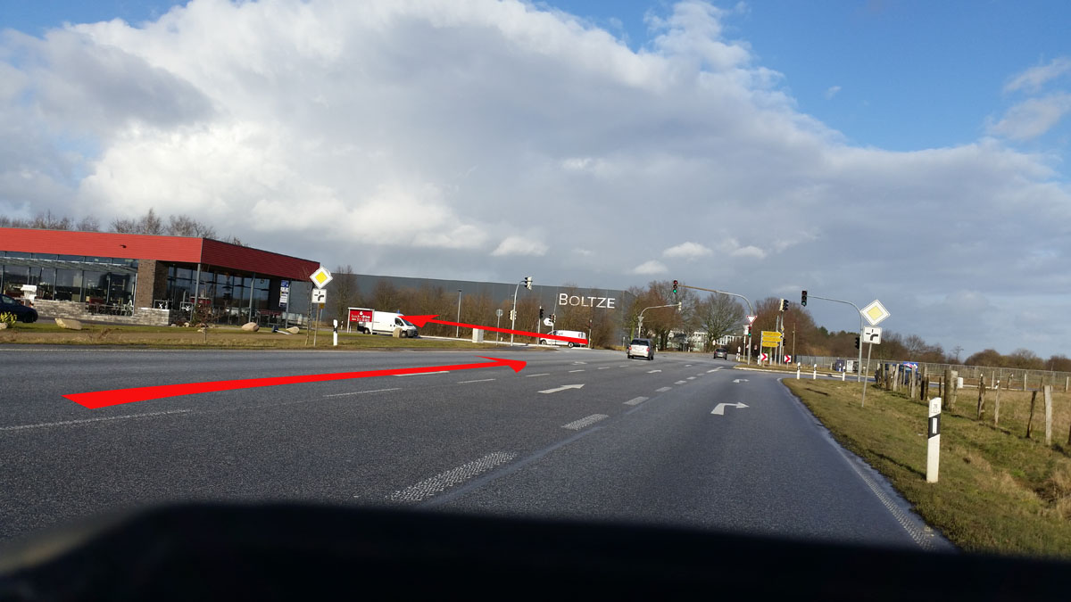 Aus Richtung Braak, Trittau kommend NICHT links Richtung Autobahn A1, sondern GERADEAUS (auch wenn es hinter der Kreuzung leicht nach links geht) in das Gewerbegebiet fahren.