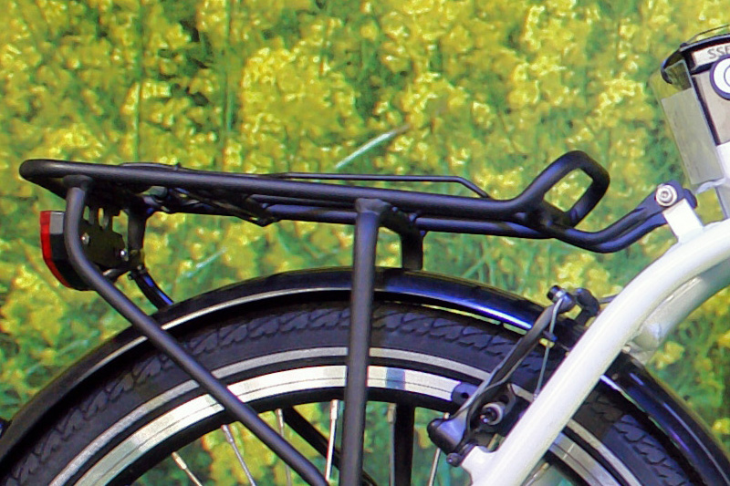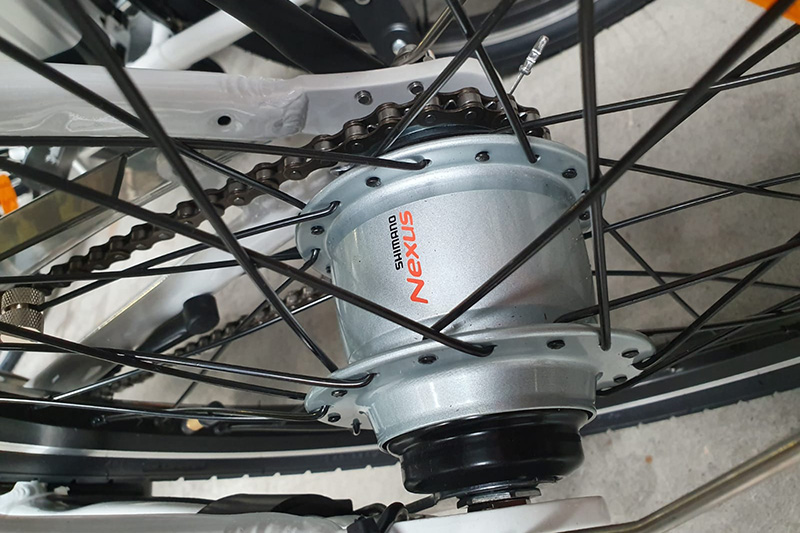 E-Klapprad Petit mit Schwalbe Big-Ben Bereifung. Die Reifen sind deutlich breiter, tragen höhere Lasten und fahren sich besser auf weichen Untergründen. Die Pannensicherheit wird von Schwalbe mit Stufe 4 angegeben. Akkuleistung wahlweise 10,5AH oder 15AH Akku für bis zu 80 oder 120 km/h Reicheite. Das Pedelec Klapprad verfügt über eine Shimano Nexus 7-Gang Nabenschaltung mit Rücktrittbremse.