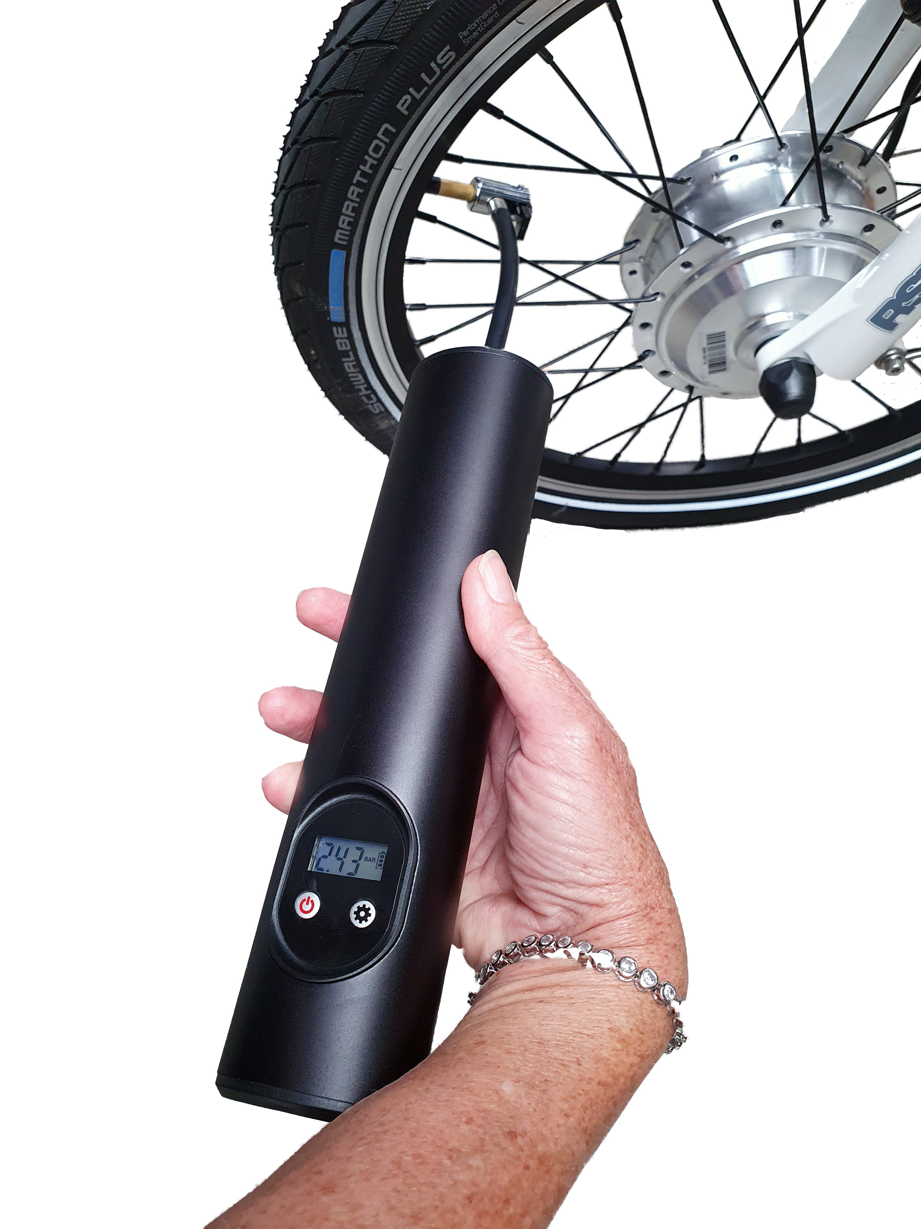 Um den Reifendruck zuverlässig prüfen zu können bedarf es eines Manometers. Die weit verbreitete Überprüfung des Reifendrucks mittels Daumendrucks ist absolut unzuverlässig! Ab einem Reifendruck von rund 2 Bar fühlt man keinen Unterschied, ob nun 3 oder 4 Bar Reifendruck vorliegen. Bei den bei unseren Elektro Klappfahrrad Petit PLUS eingesetzten SCHWALBE Marathon Plus Reifen ist die Daumenprobe sogar völlig unzureichend! Als Prüfgerät und zum Aufpumpen eignet sich sehr gut die in unserem Onlineshop und bei uns vor Ort erhältliche elektrische Fahrradpumpe .